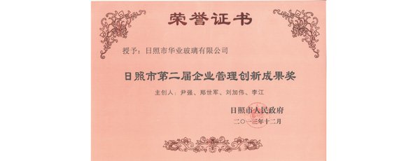 華業玻璃被日照市人民政府授予“日照市第二屆企業管理創新成果獎”