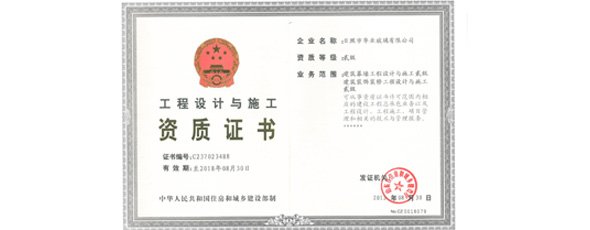 華業玻璃獲得“建筑幕墻工程設計與施工一體化”貳級資質、“建筑裝飾裝修工程設計與施工一體化”貳級資質、“金屬門窗工程專業承包叁級資質”。