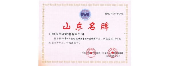 “華一”牌Low-E鍍膜節能中空玻璃產品,被認定為2018年度山東名牌產品。